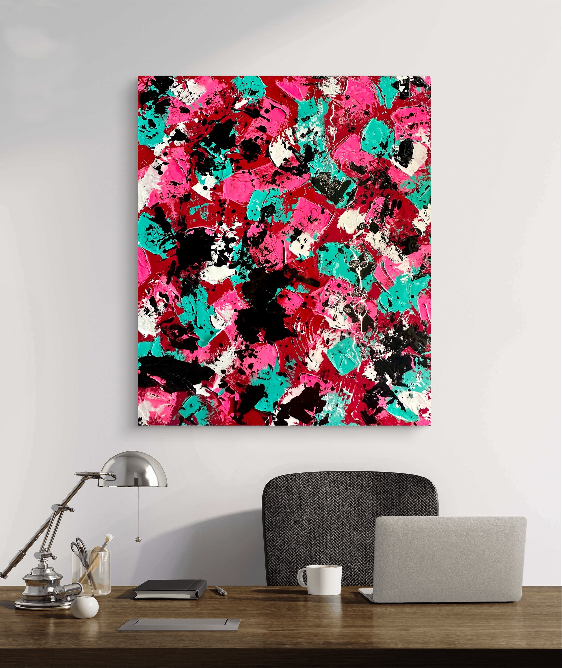 Every gesture is instinctive, every stroke is tension. The dense, dynamic, almost living texture gives the canvas a strong three-dimensional quality, turning it into a chromatic battlefield. The final touch is a glossy resin coating that envelops the piece like glass, enhancing its colours, depth, and texture. The result is a striking visual effect that adds a refined, modern finish ideal for exclusive interiors and discerning art collectors.