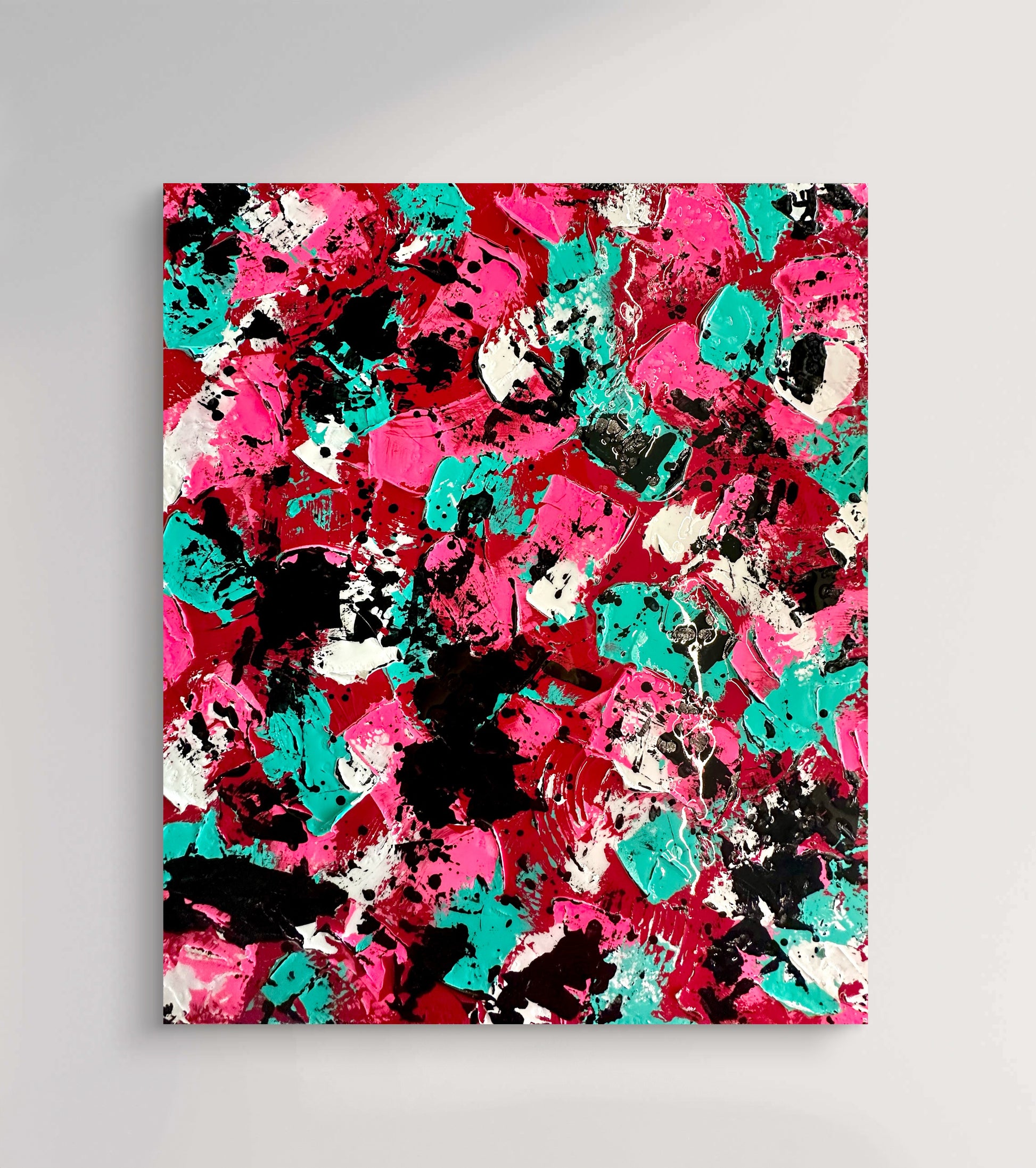 Ogni gesto è istinto, ogni segno è tensione. La materia – spessa, dinamica, quasi viva – conferisce tridimensionalità alla superficie, trasformando il quadro in un campo di battaglia cromatico. A completare l’opera, uno strato di resina lucida che la avvolge come vetro, esaltandone i colori, le texture e la profondità. Un effetto visivo di grande impatto, che dona all’opera una luminosità raffinata e contemporanea, rendendola perfetta anche per ambienti esclusivi e collezioni d’arte.