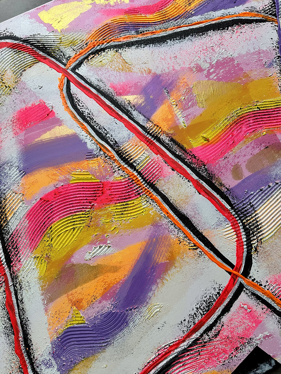 "Fluo Rockstar" is an explosion of colour and rhythm, a canvas that seems to pulse under the viewer’s gaze. The raised sections, created with textured paste, bring a three-dimensional movement that guides the eye through dynamic lines and luminous fields.