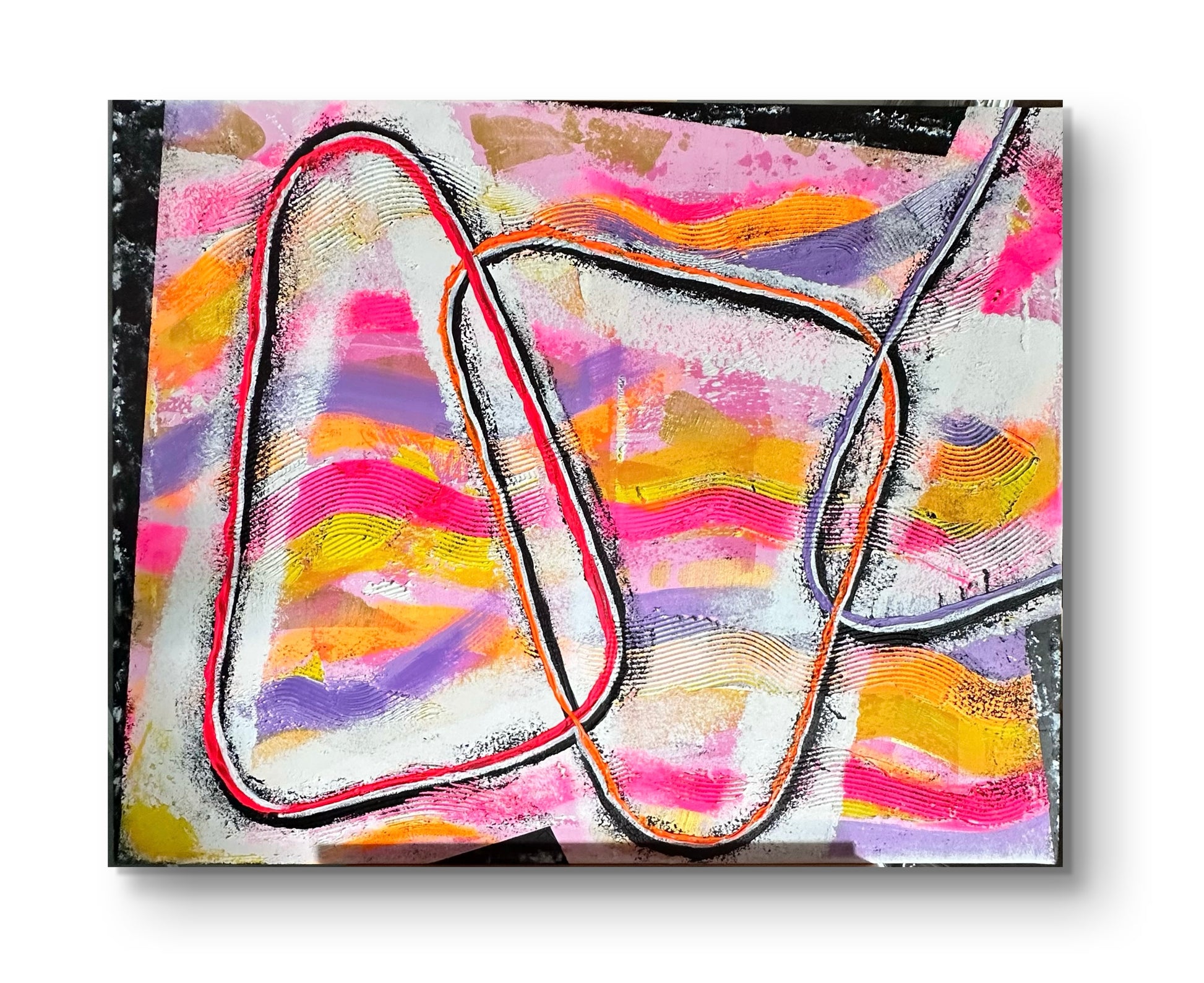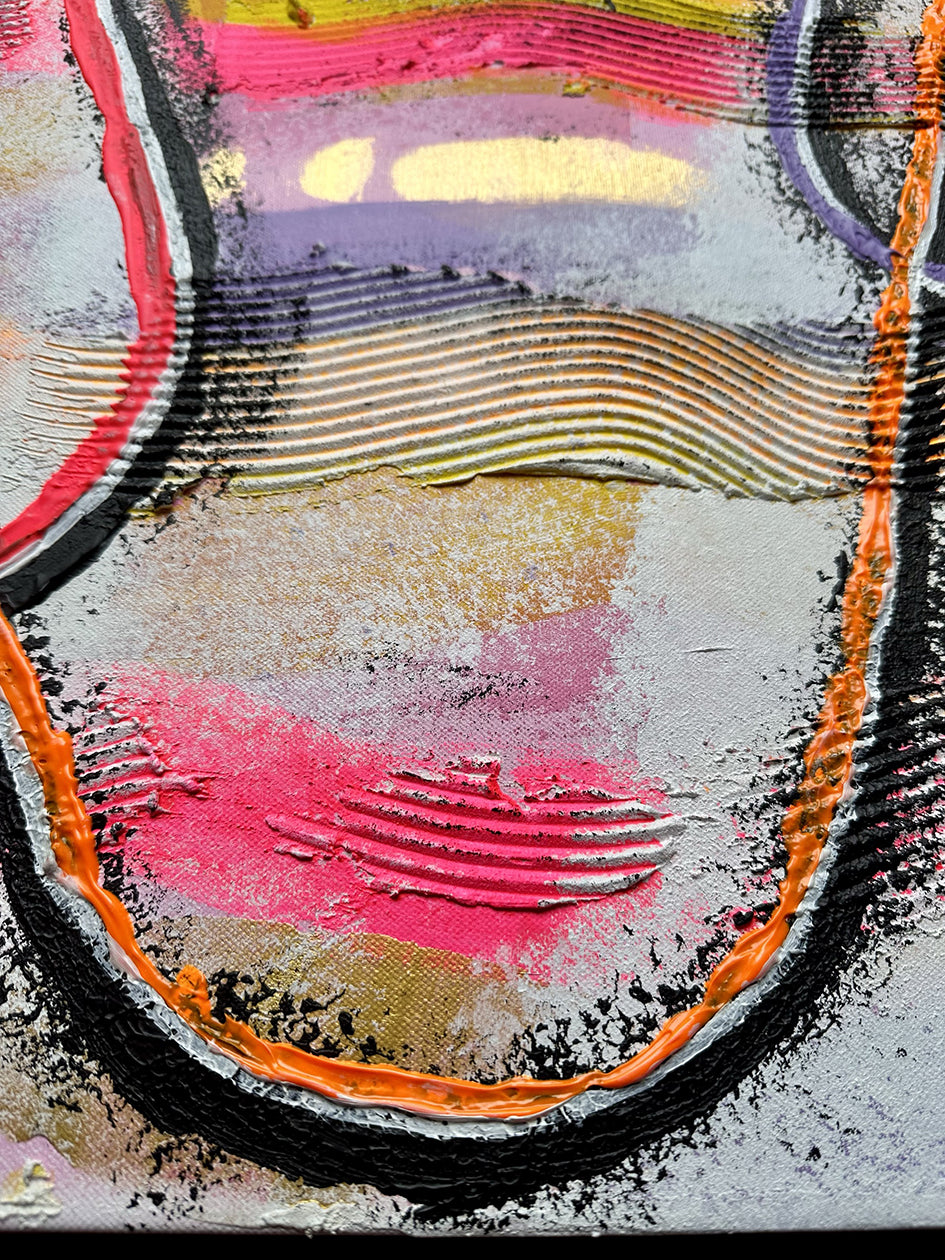 "Fluo Rockstar" è un’esplosione di colore e ritmo, una tela che sembra vibrare sotto lo sguardo di chi la osserva. Le parti in rilievo, realizzate con pasta materica, creano un movimento tridimensionale che guida l’occhio in un percorso dinamico tra linee sinuose e campiture luminose.