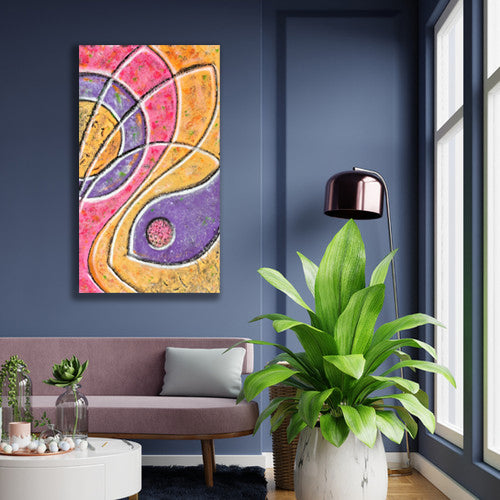 La brillantezza dei colori – giallo oro, rosa intenso, viola profondo e arancio caldo – genera energia e movimento, guidando lo sguardo in un percorso curvilineo e avvolgente.
