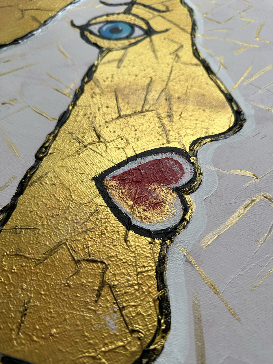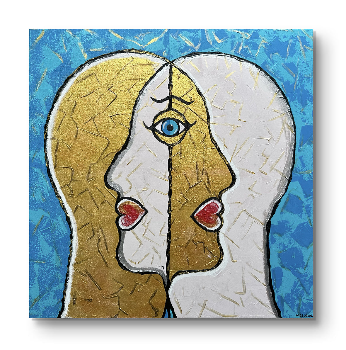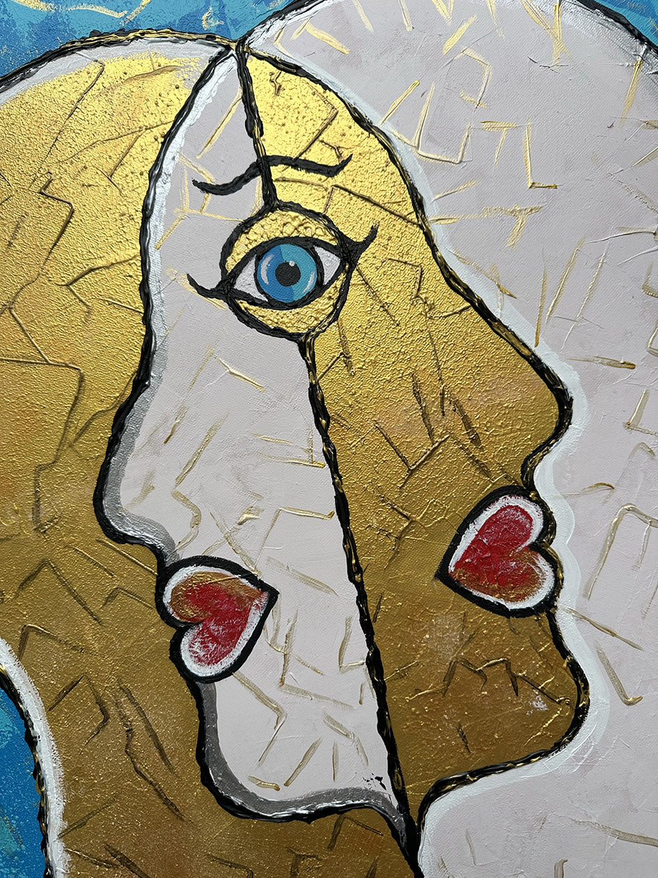 Il fondo azzurro, simbolo di serenità e infinito, accoglie figure dalle tonalità oro e bianco, con labbra rosse e uno sguardo azzurro che cattura e incanta. L’uso del colore in rilievo crea texture tattili, mentre l’oro aggiunge luce e preziosità, evocando la bellezza dell’unione e la ricchezza interiore.